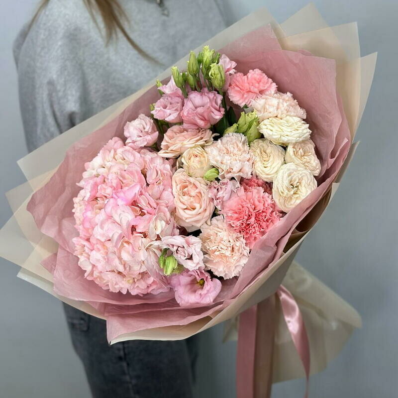 Букет с розовой гортензией ,кустовыми розами ,диантусами и эустомой