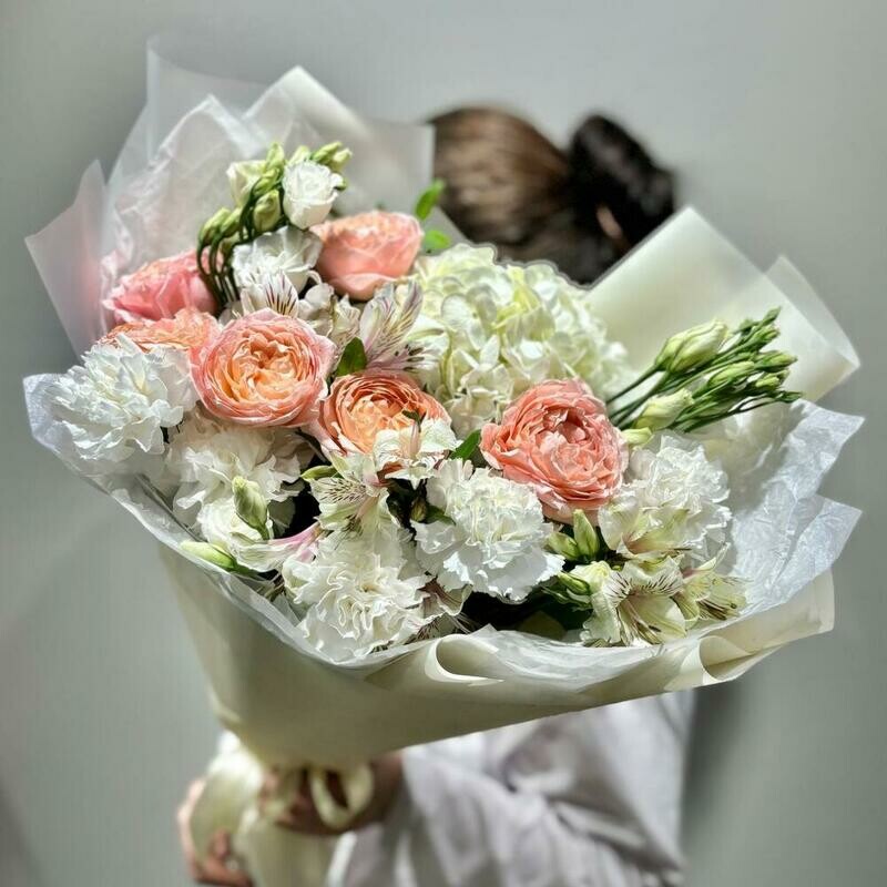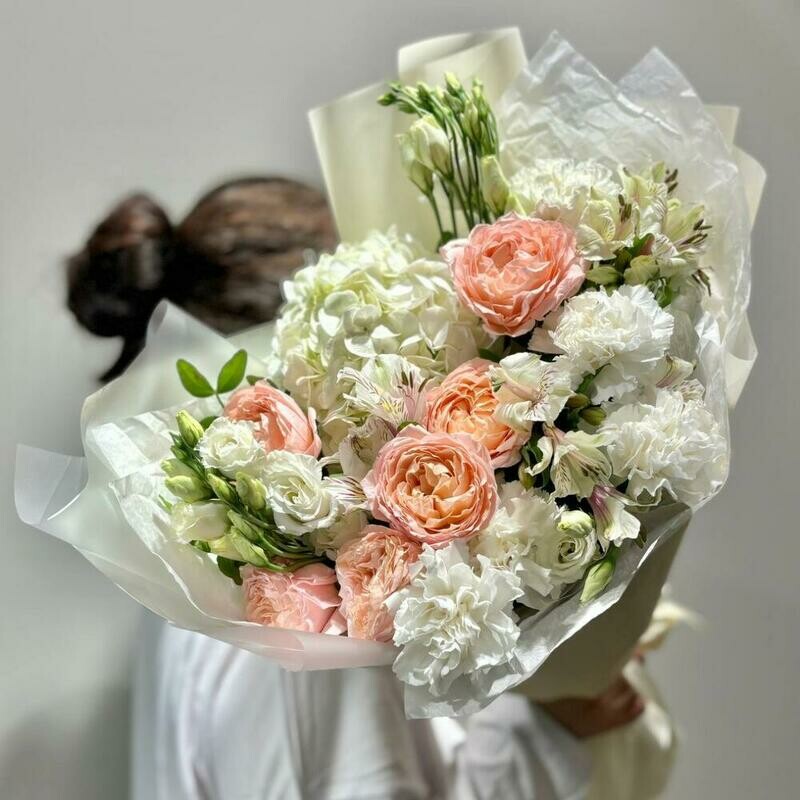 - Авторский букет: Пионовидная роза | Гортензия | Лизиантус