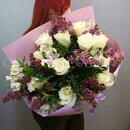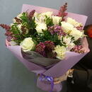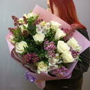 Альстромерия - 5 шт. Сирень - 4 шт. Роза Кенийская - 9 шт. Фисташка - 3 шт. Упаковка дизайнерская - 2 шт.