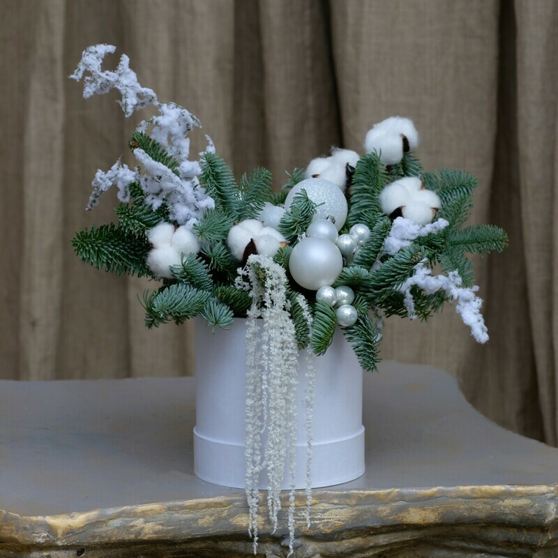 Зимняя композиция в шляпной коробке "Белый иней"