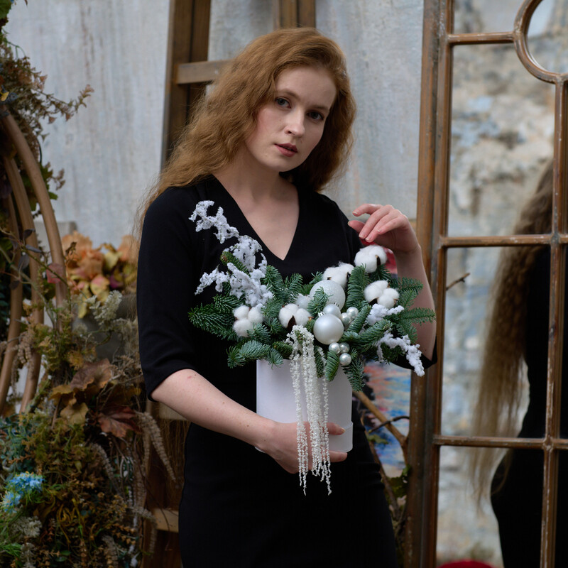 Зимняя композиция в шляпной коробке "Белый иней", стандартный