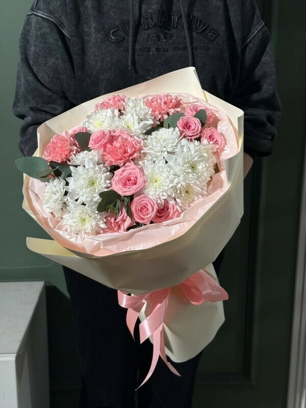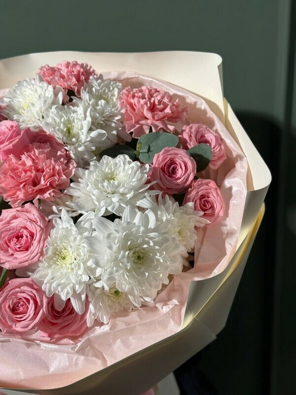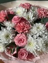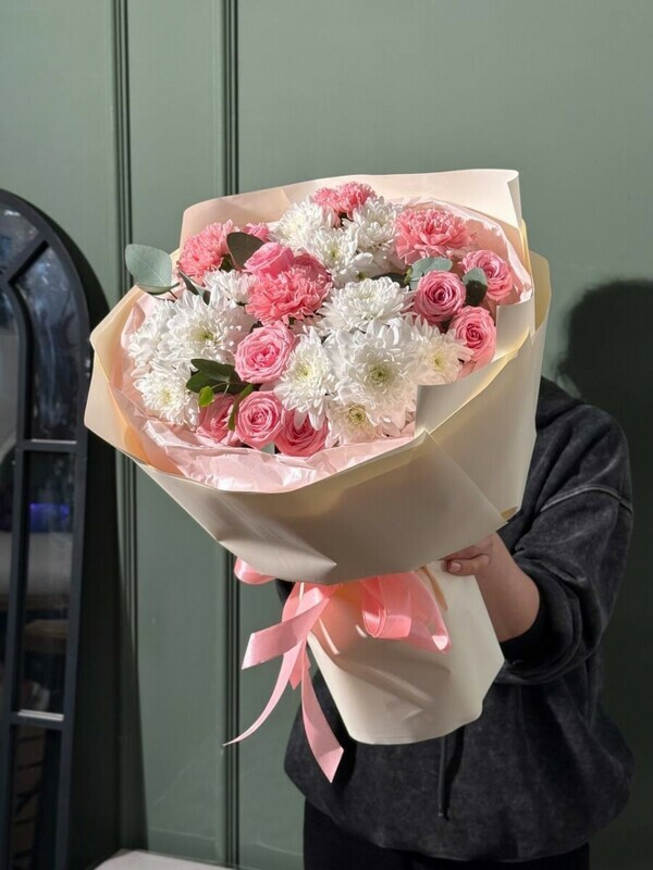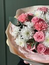 - Сборный букет с хризантемой, диантусами и пионовидной кустовой розой