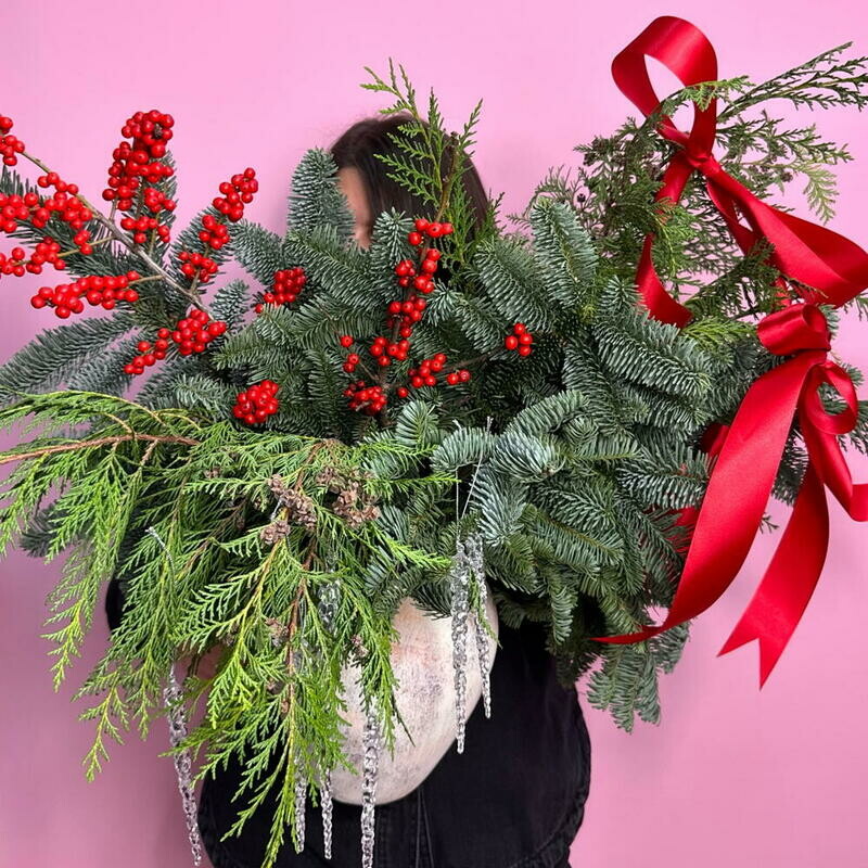 Ваза с хвойным миксом «Ледовая рябина», премиум