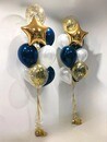 Фонтаны "Долгожданный выпуск", 2 фонтана по 10 единиц каждый с гелием на грузе, состоит из: звезда золото 45 см, 3 латекс конфетти золото, 3 белый металлик, 3 синий дабл стафф Весь латекс обработан специальным раствором для долготы полета. Упаковка в транспортировочный пакет