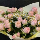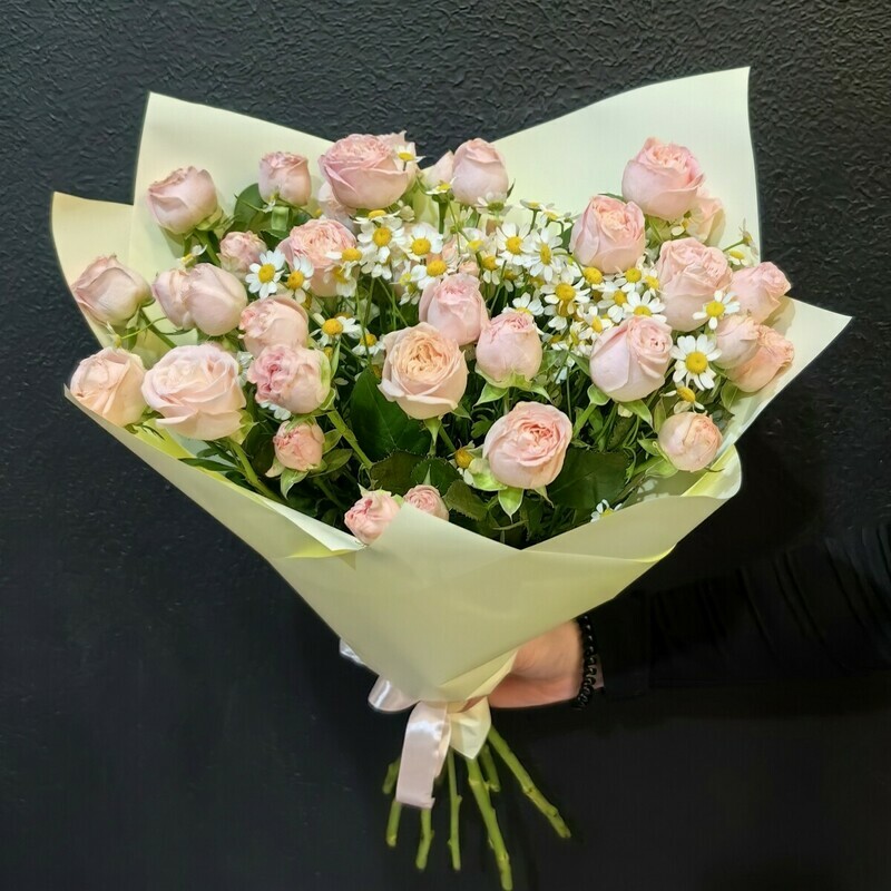 Авторский нежный букет из кустовых пионовидных роз и ромашек в дизайнерской упаковке