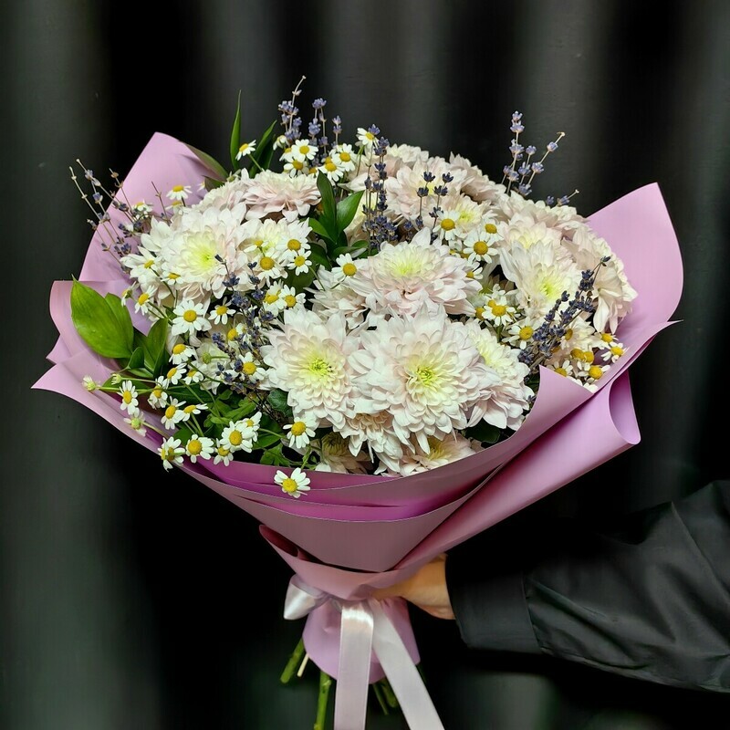 Авторский букет с хризантемой, ромашками и лавандой в стильной упаковке
