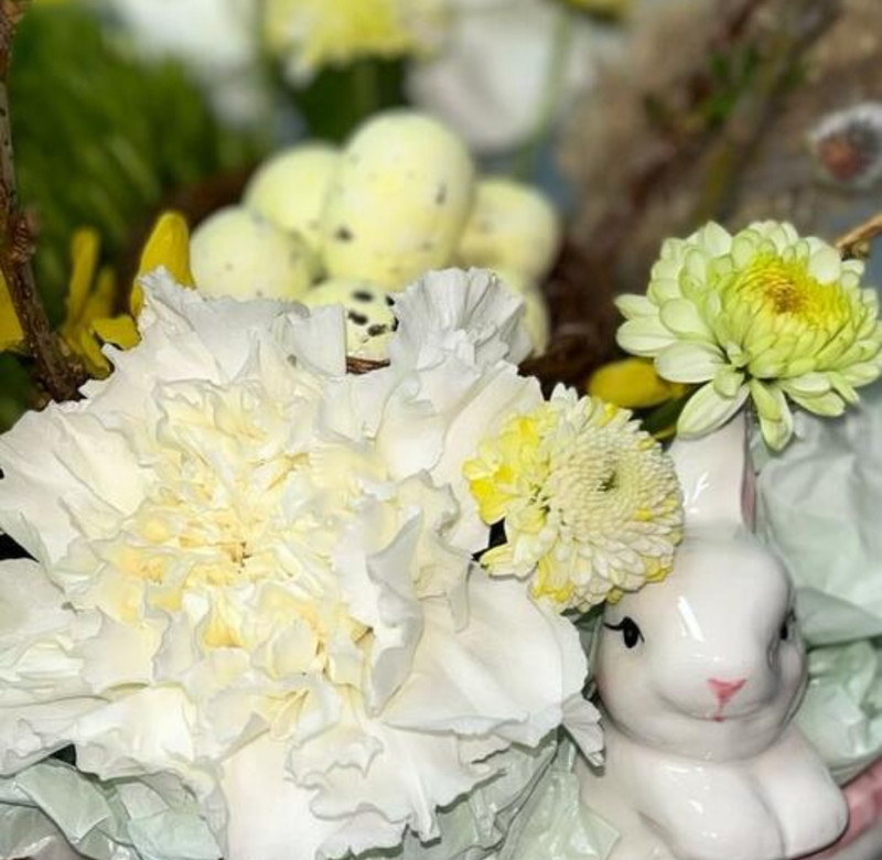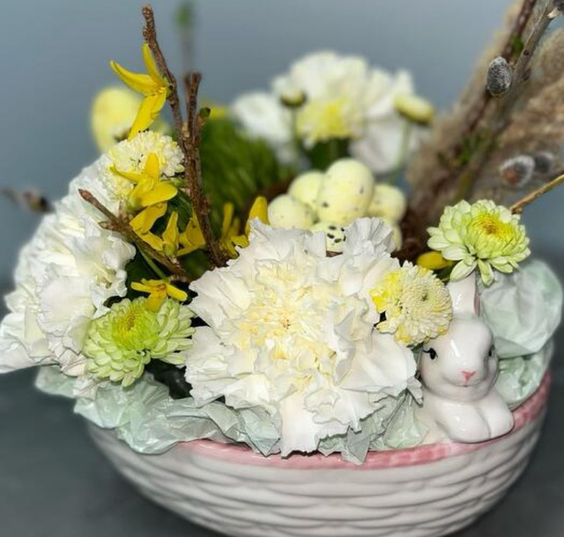 - Композиция на Пасху с цветами и вербой в блюде с зайкой
