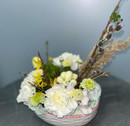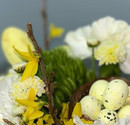 Композиция на Пасху с цветами и вербой в блюде с зайкой