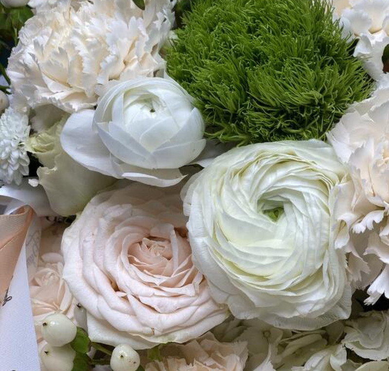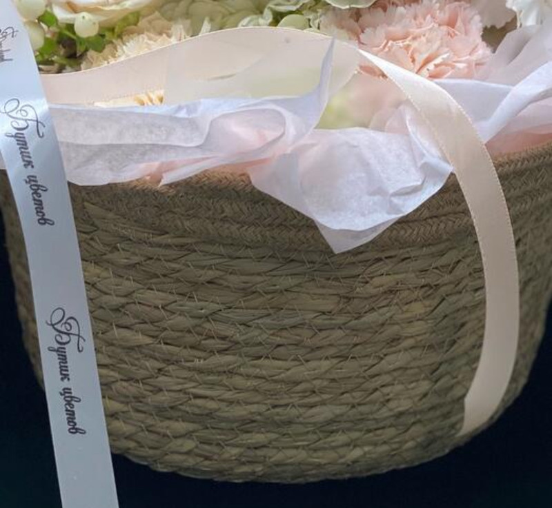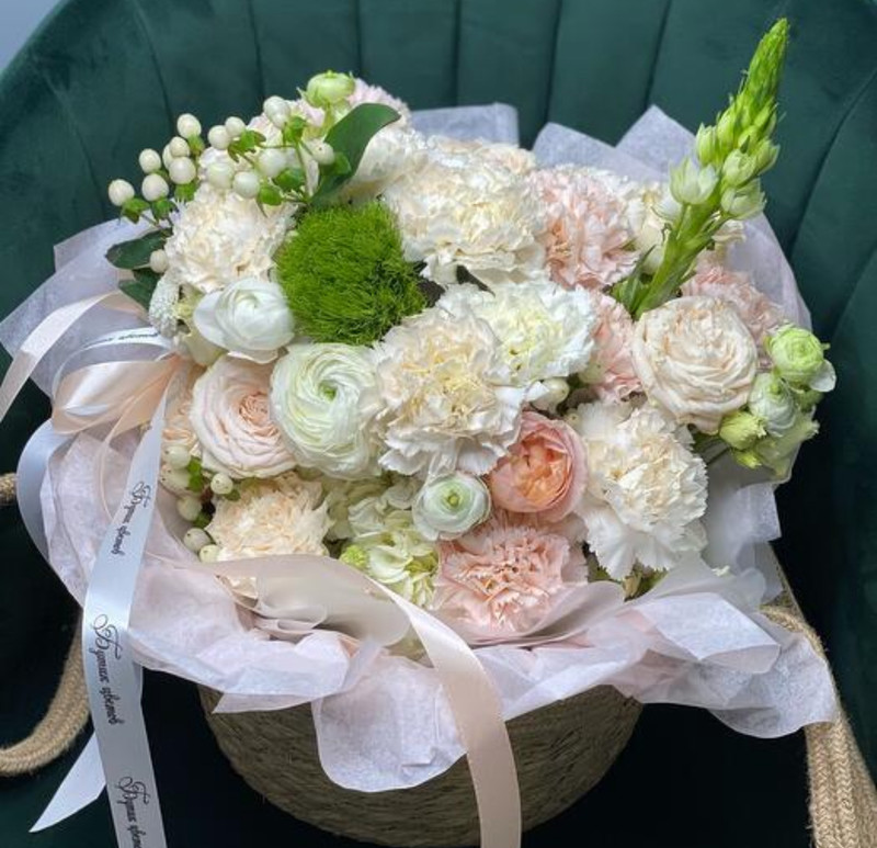 - Композиция с ранункулюсами, пионовидными розами, диантусами и экзотикой в плетеной корзине