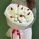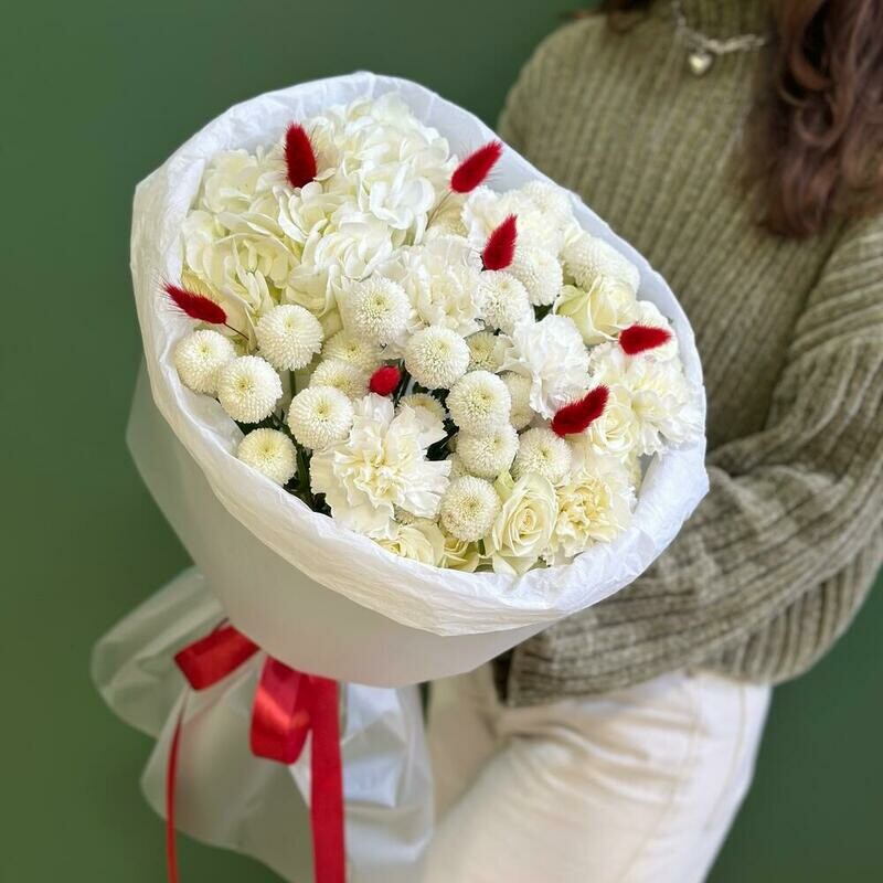 - Белоснежный букет с гортензией, диантусами, белыми розами и сухоцветами