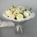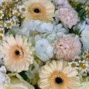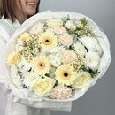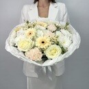 В центре внимания — пять песочных гербер, которые придают букету мягкое сияние и подчёркивают его естественную свежесть. Их пастельный тон удачно перекликается с текстурой цветов вокруг. Одна ветка белой гортензии добавляет композиции пышности и глубины, создавая крупное, мягкое облако, которое делает букет визуально более объёмным.
