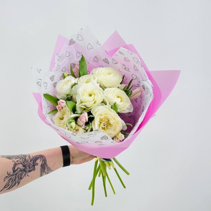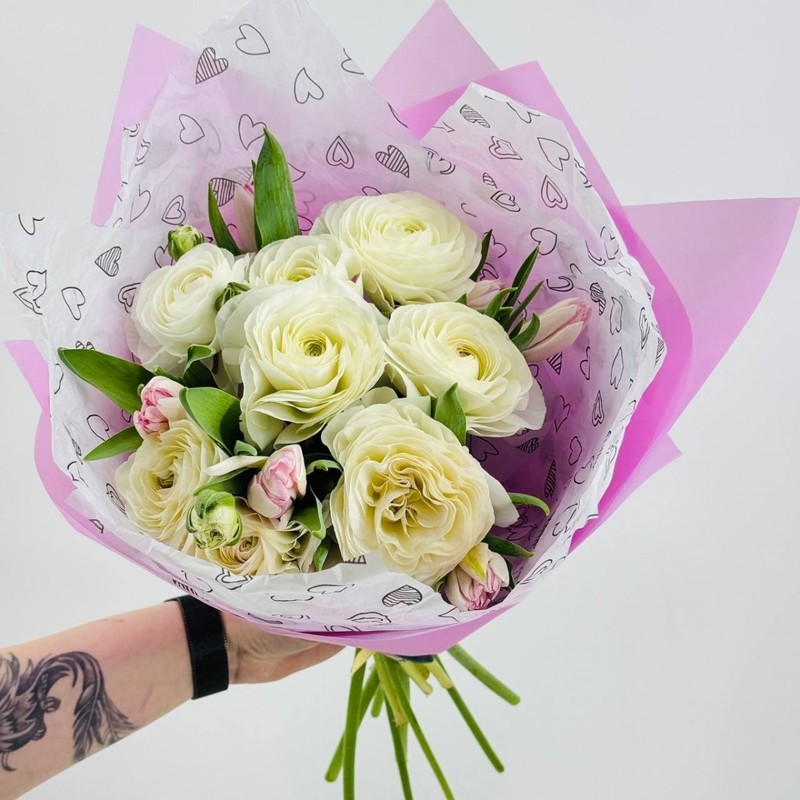 Букет из нежных ранункулюсов с тюльпанами. Цветы на праздник для девушки, женщины