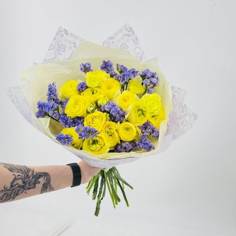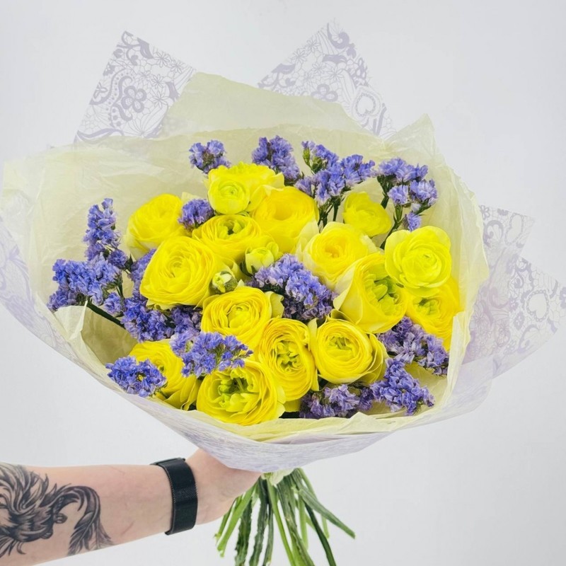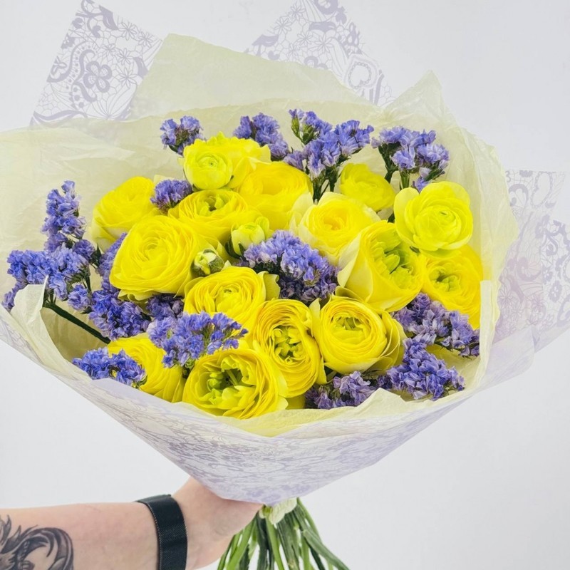 - Букет из жёлтых лимонных ранункулюсов с веточками статицы