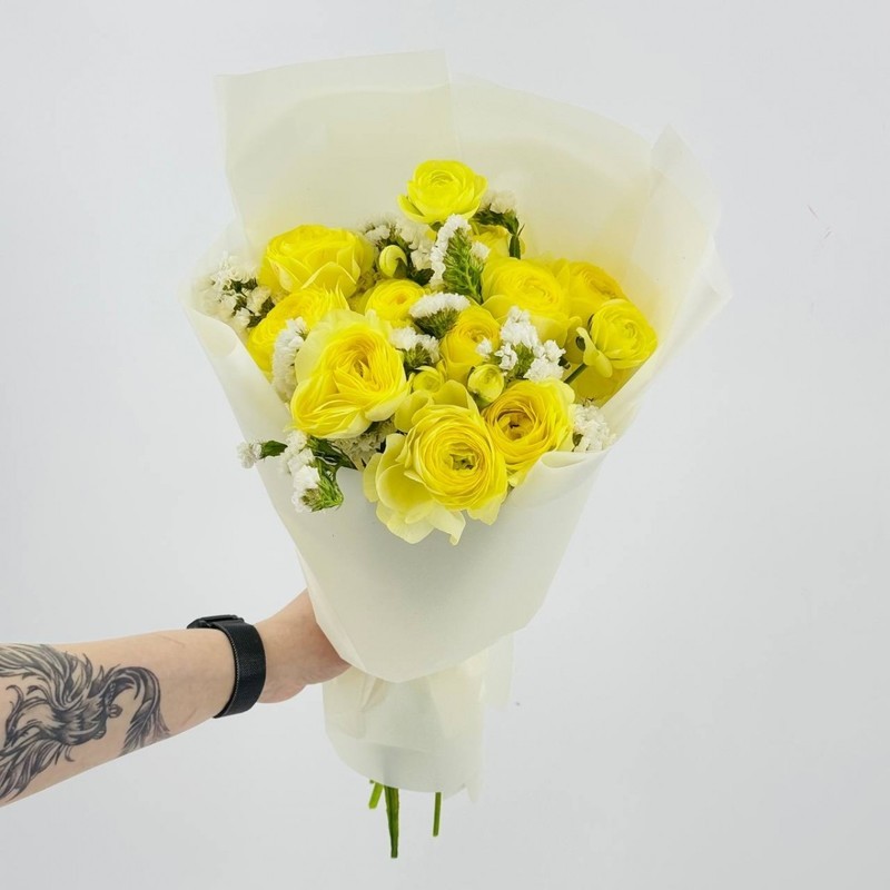 Жёлтые лимонные ранункулюсы и статица. Яркий букет на день рождения, стандартный