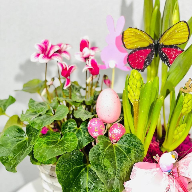 Весенние первоцветы в плетёном кашпо. Тюльпан, цикламен, гиацинт, стандартный