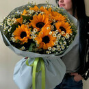 Летний букет из подсолнухов и ромашек танацетум, стандартный