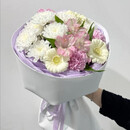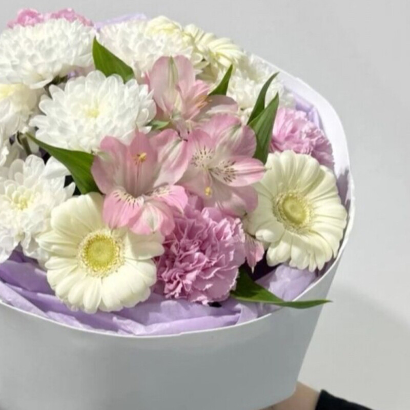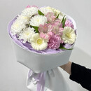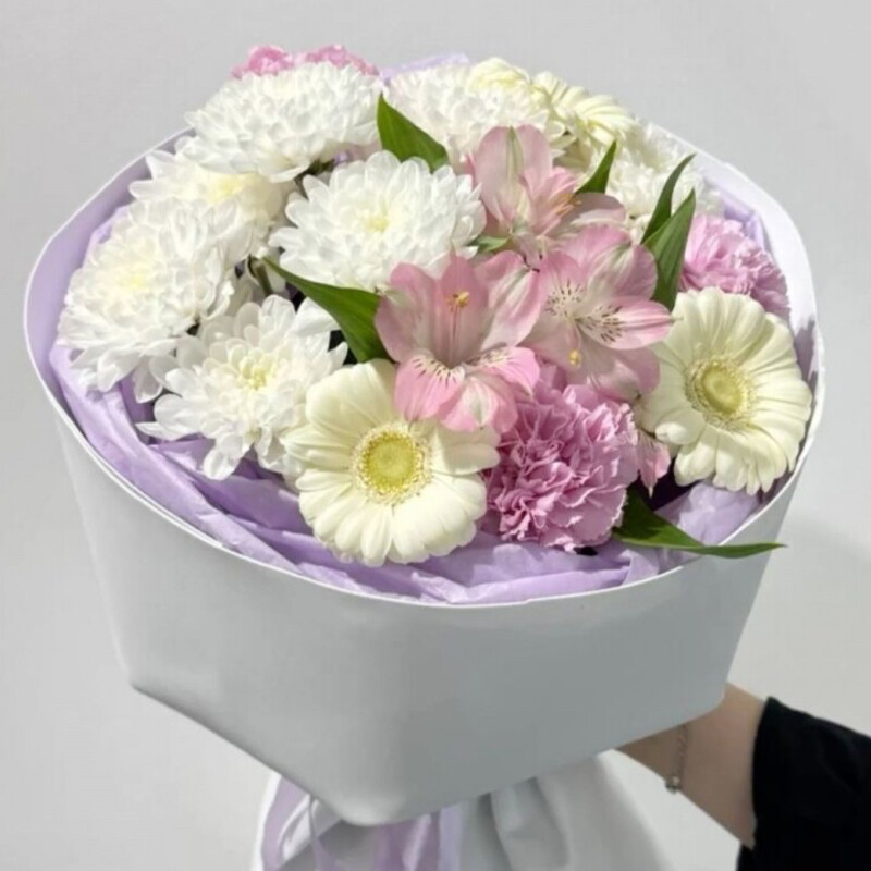 Авторский букет с гермини — гармоничная композиция из кустовой хризантемы, мини-герберы, альстромерии и гвоздики. Подходит для любых случаев и станет прекрасным подарком для близких.