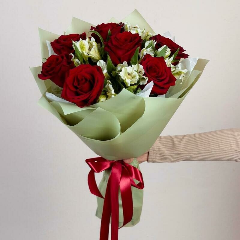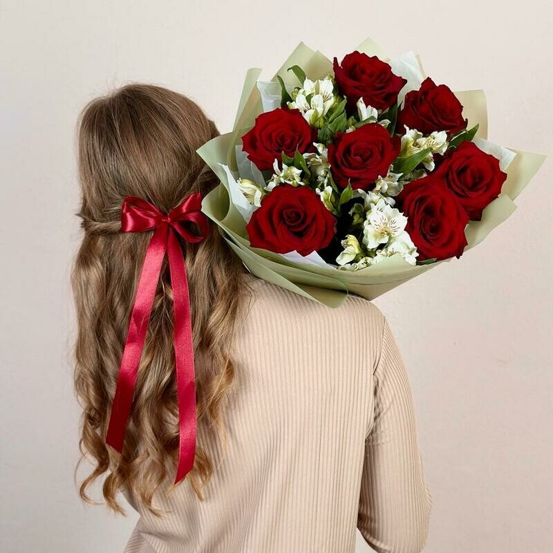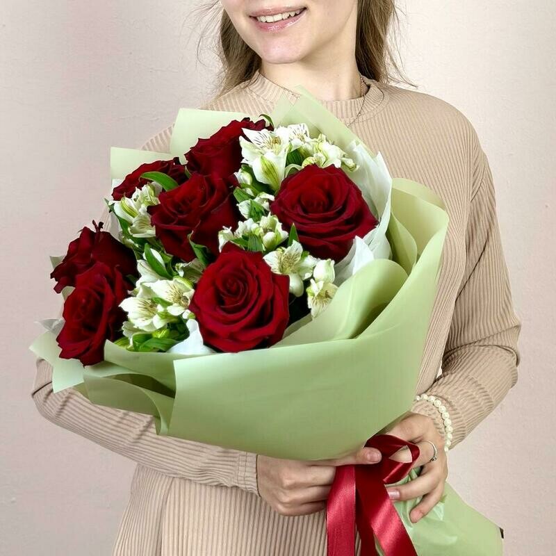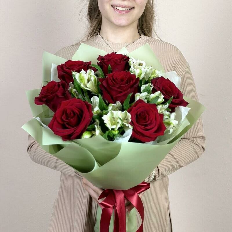 Очаровательный букет красных роз .с белой альстромерией, стандартный