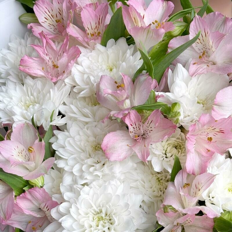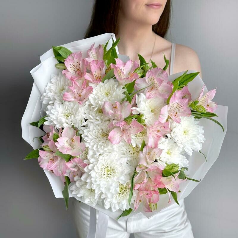 Нежный букет в пастельных тонах из кустовой хризантемы и альстромерии. Эти цветы очень стойкие и будут долго радовать своей красотой :) Не забудьте подрезать цветы НЕПОСРЕДСТВЕННО перед тем как ставить в вазу (после подрезки в течении 2-3 секунд поставьте в воду). Не храните букет на прямых солнечных лучах и возле отопительных приборов, чтобы сохранить цветы свежими как можно дольше. Обратите внимание на размеры букета и фото в полный рост с человеком, для понимания размера композиции, это фото есть в карточке товара :)
