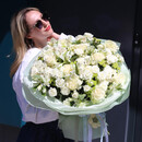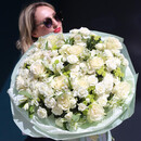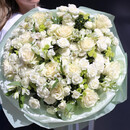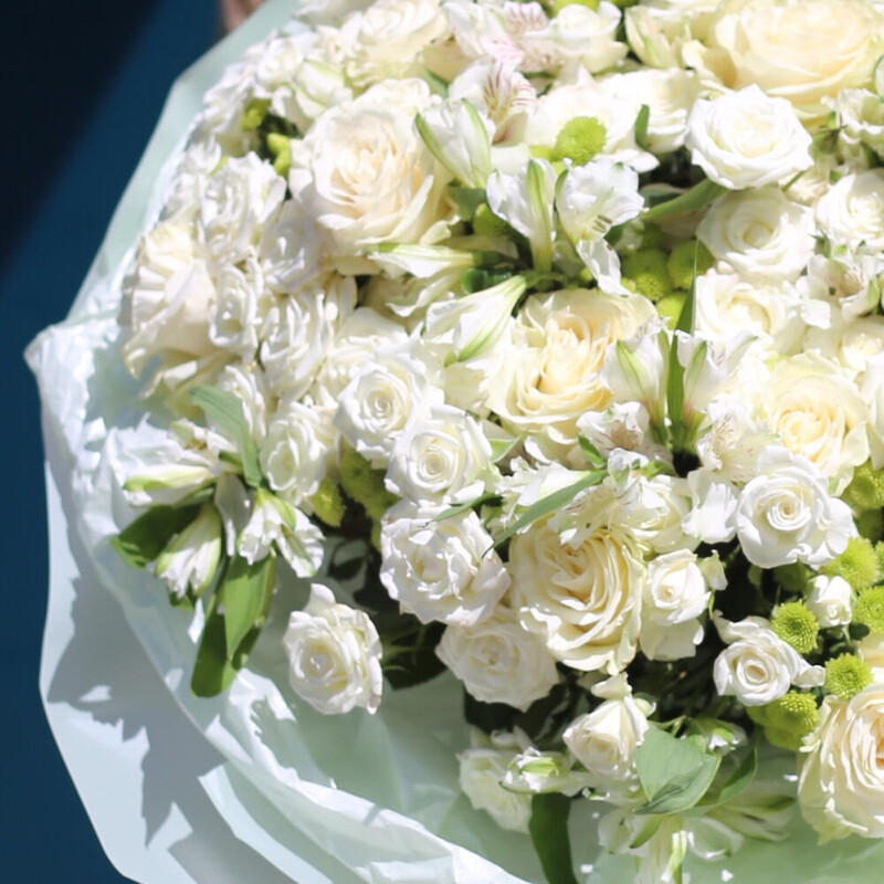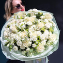 WOW Букет «Нежная привязанность» — это авторская композиция в благородной бело-зеленой гамме, воплощающая чистоту, свежесть и изысканную элегантность. Роскошные пионовидные розы Mondial, нежные кустовые розы Lyrica, яркие хризантемы и изящные альстромерии создают идеальный баланс форм и оттенков.