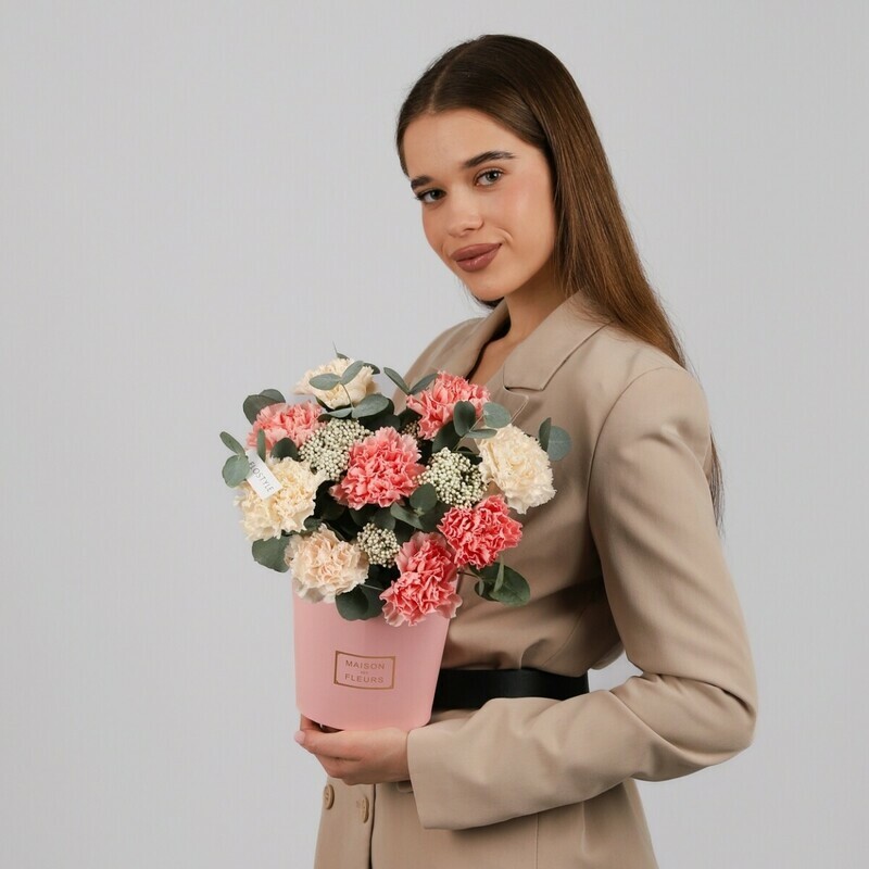 Цветы в коробке диантусы с эвкалиптом