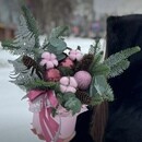 - Композиция в шляпной коробке с новогодним декором в розовой гамме