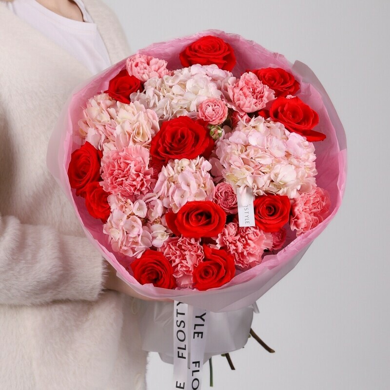 Этот яркий и эффектный букет сразу привлекает внимание насыщенными алыми оттенками и выразительным контрастом цветов. В основе композиции — красные розы, которые символизируют страсть, силу чувств и искренние эмоции. Нежная розовая гортензия добавляет букету объём и мягкость, а гвоздика подчёркивает фактуру и делает композицию более живой и динамичной. Розовая кустовая роза гармонично смягчает образ, создавая красивый баланс между яркостью и нежностью. Букет собран в круглой форме с нейтральным оформлением, что делает его универсальным подарком для любого повода. Мы предлагаем быструю и аккуратную доставку букета в Новосибирске, чтобы ваш подарок произвёл идеальное впечатление и приехал свежим и красивым