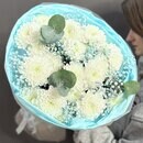 - Букет из кустовых хризантем, голубой гипсофилы и веточками эвкалипта