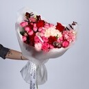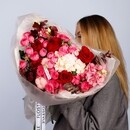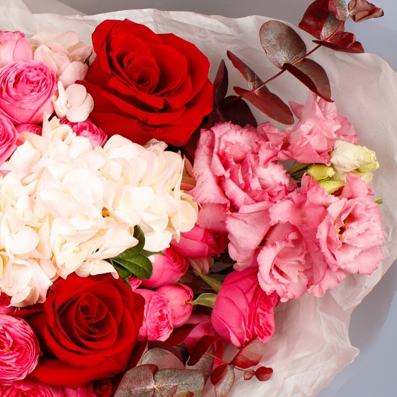 Эксклюзивный авторский букет в насыщенной красно-розовой гамме. Благородные красные розы, нежная розовая гортензия, изящная эустома и оригинальные веточки хлопка создают стильную фактурную композицию, которая выглядит дорого и современно.
