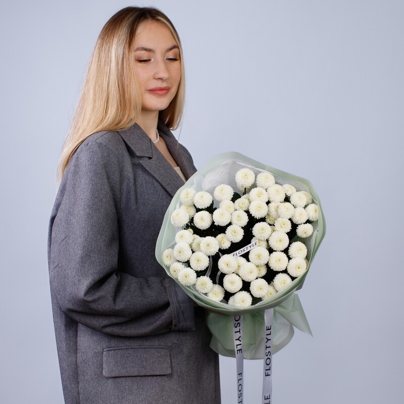 Состав: Хризантема Newton - 7 шт, Фисташка - 2 шт, Тишью белая, Матовая пленка белая кругом Размер: Диаметр: 30 см / Высота: 50 см Стильный монобукет из 7 кустовых хризантем сорта Ньютон. Эти нежные цветы с оригинальной формой лепестков создают объемную и воздушную композицию, которая выглядит современно и свежо. Хризантемы Ньютон известны своей удивительной стойкостью — они будут радовать получателя до 3 недель. FLOSTYLE бережно доставит этот букет в любую точку города. Прекрасный выбор для подарка на день рождения, юбилей, 8 Марта или просто как трогательный знак внимания без повода. Закажите доставку цветов для создания уютного настроения!