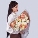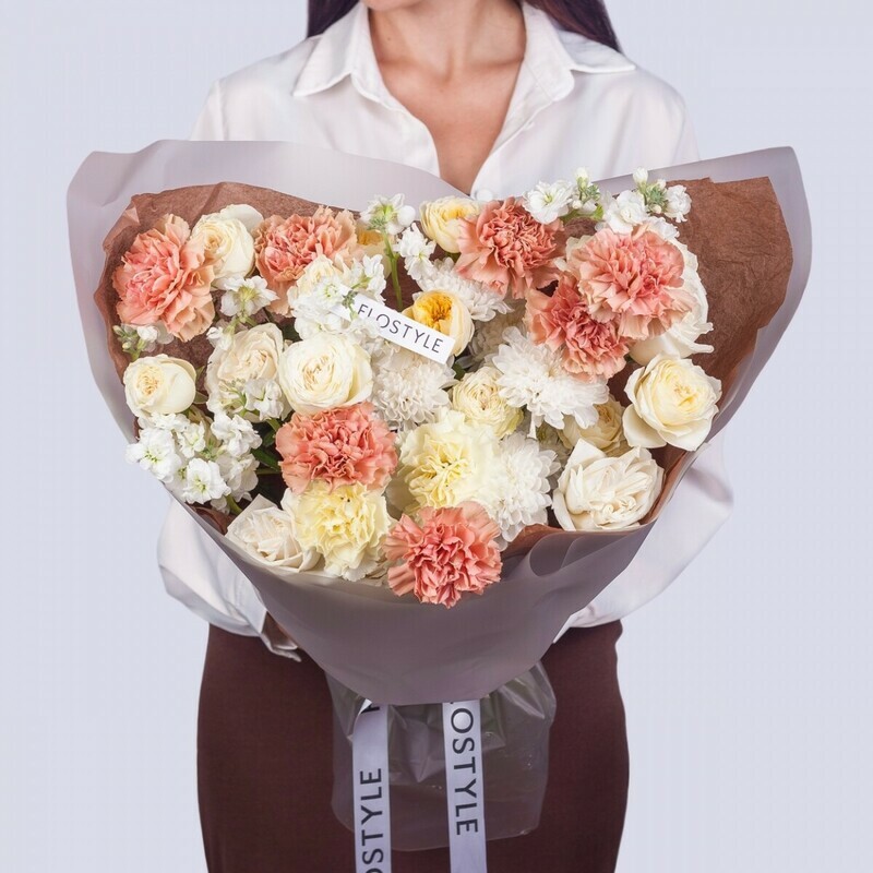 Нежный букет с розами Плайя Бланка, хризантемой, диантусами и ароматной маттиолой от FLOSTYLE. В этой композиции сочетаются изящество и утонченность: пастельные оттенки роз Плайя Бланка и диантуса, элегантная хризантема, душистая маттиола и прекрасная кустовая роза. Стильная упаковка дополняет шарм букета и делает его идеальным подарком на 8 Марта, 14 февраля, день рождения, годовщину свадьбы или помолвку. Прекрасный выбор для мамы, жены, сестры или возлюбленной. Свежие цветы с доставкой по Новосибирску и области. Закажите этот изысканный букет в FLOSTYLE прямо сейчас!