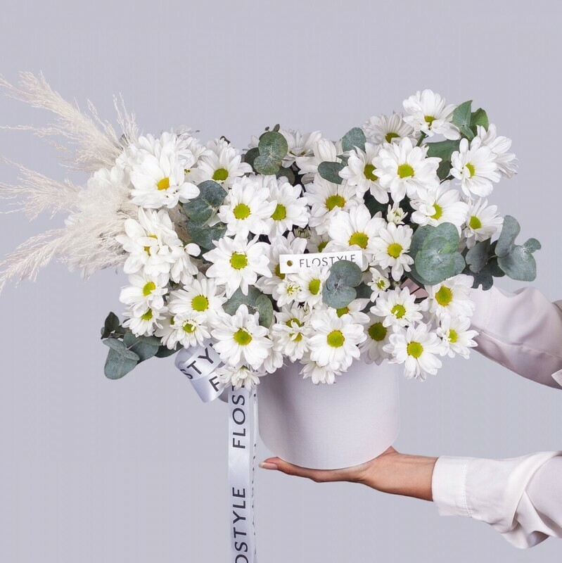 Ромашковая хризантема в коробке с пампасной травой и эвкалиптом от FLOSTYLE. Трендовая, фактурная композиция для ценителей богемной эстетики: нежная ромашковая хризантема, пушистая пампасная трава и свежий эвкалипт в стильной коробке. Коробка не требует вазы и становится эффектным украшением любого интерьера. Идеальный подарок на 8 Марта, день рождения, новоселье, свидание или сюрприз без повода. Прекрасный выбор для мамы, подруги, сестры или творческой личности — пампасная трава символизирует уют и природную гармонию, а хризантема добавляет нежности и свежести. Свежие цветы с доставкой по Новосибирску и области. Закажите эту стильную композицию в FLOSTYLE прямо сейчас!
