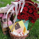 В этом подарке всё прекрасно: свежие розы, шоколад, трогательная игрушка