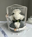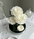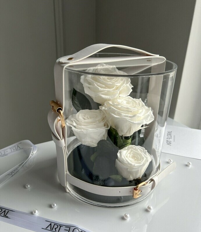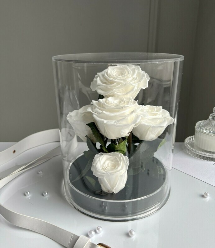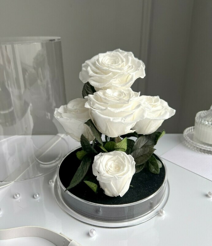 Застывшая поэзия, вечность в чистом виде. Пять безупречных белых роз, застывших в момент идеального расцвета, теперь живут в прозрачном акриловом саду. Это не просто букет — это символ. Символ чистой, вневременной любви, светлой верности и новых начал.