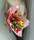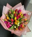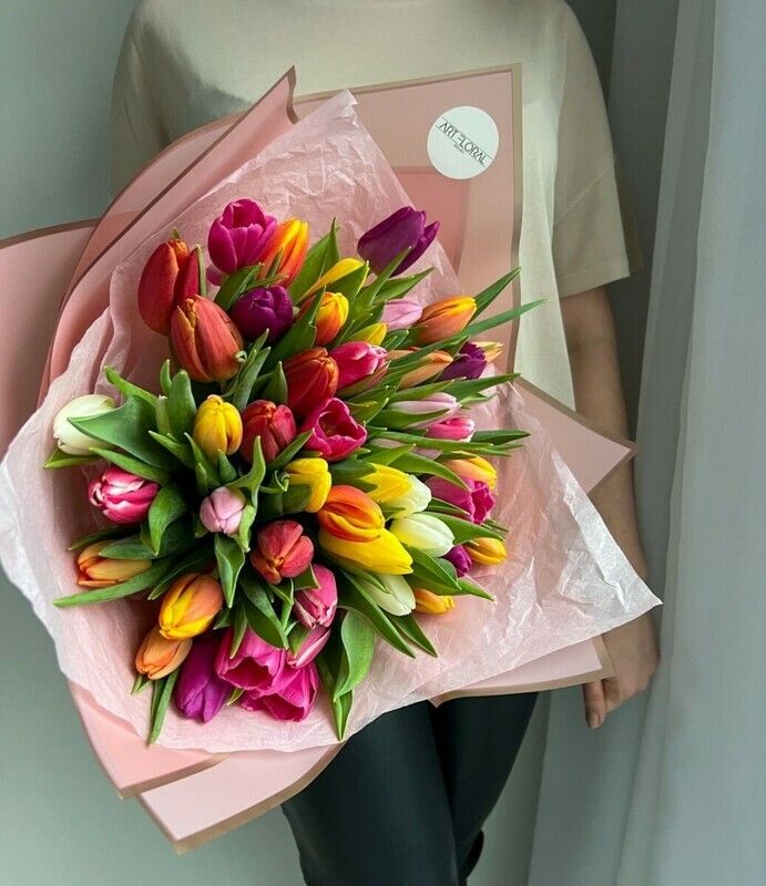 Есть особая магия в простых вещах. Пучок разноцветных тюльпанов — это как пойманная и поставленная в воду радуга. Их гладкие стебли тянутся к свету, а чашечки, будто акварельные, хранят на своих лепестках всю нежность весеннего неба на рассвете, жар полуденного солнца и прохладную синеву сумерек. Этот букет не стремится удивить вычурностью. Его сила — в искренности и простоте. Он напоминает, что счастье часто кроется в таких вот небольших, но прекрасных моментах: в первом тепле, в пении птиц и в пёстрой россыпи цветов на рыночном прилавке. Для ценительницы естественной, непридуманной красоты.