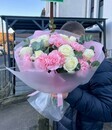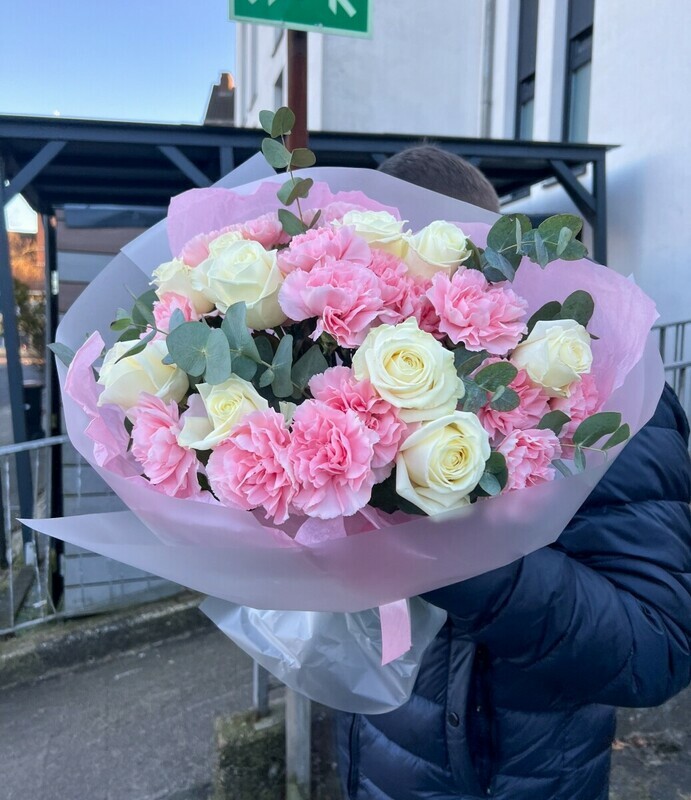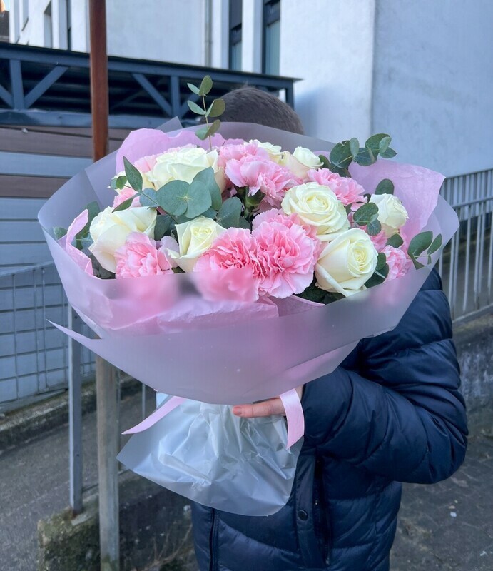 Им вторит нежная розовая гвоздика — цветок благодарности, материнской любви и тёплых воспоминаний. Её махровые, словно вырезанные из тончайшего бархата лепестки добавляют букету уют, домашнее тепло и душевность. А серебристый эвкалипт окутывает этот союз свежим, чуть терпким ароматом, словно оберегая хрупкую красоту.