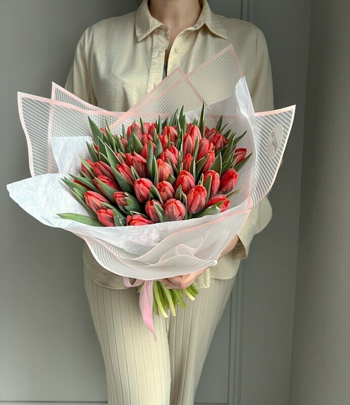 Представьте себе мгновение, когда заходящее солнце окрашивает морские волны в нежные оттенки коралла и лосося — именно такое волшебство воплотилось в этом букете . Эти тюльпаны словно созданы из расплавленного жемчуга и утренней зари. Их лепестки переливаются от нежно-персикового у основания до насыщенного лососевого на кончиках, напоминая о тёплых волнах океана и безмятежном счастье.
