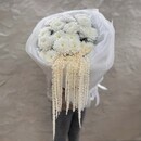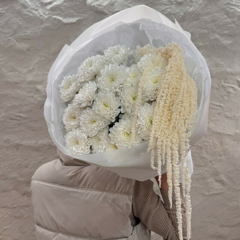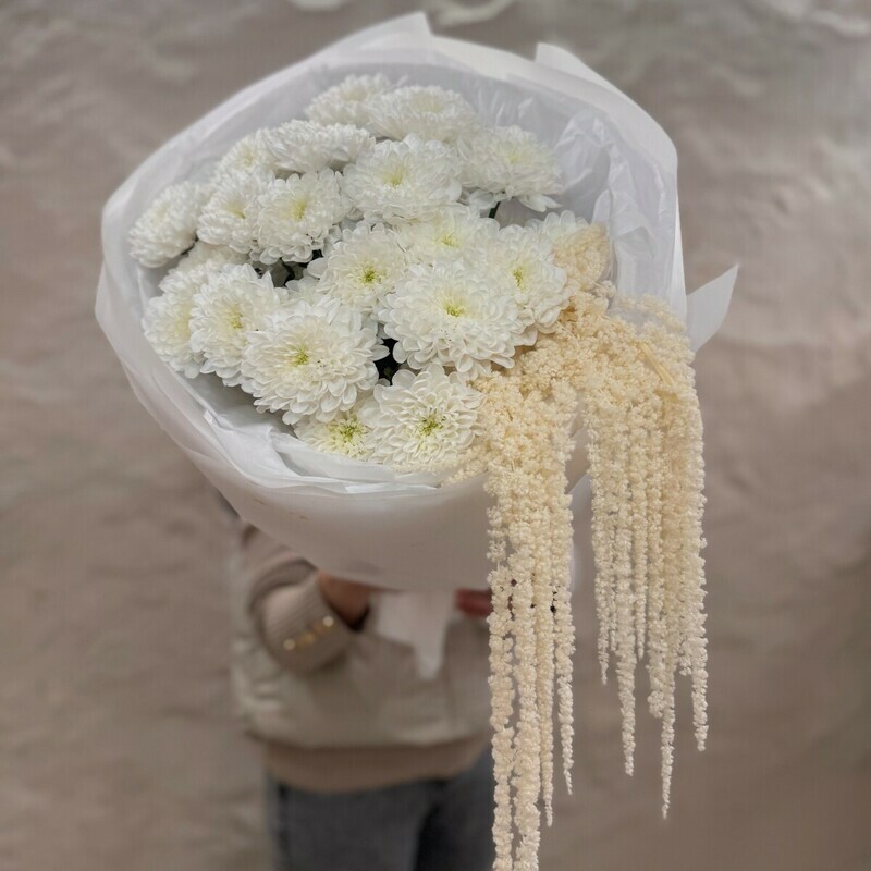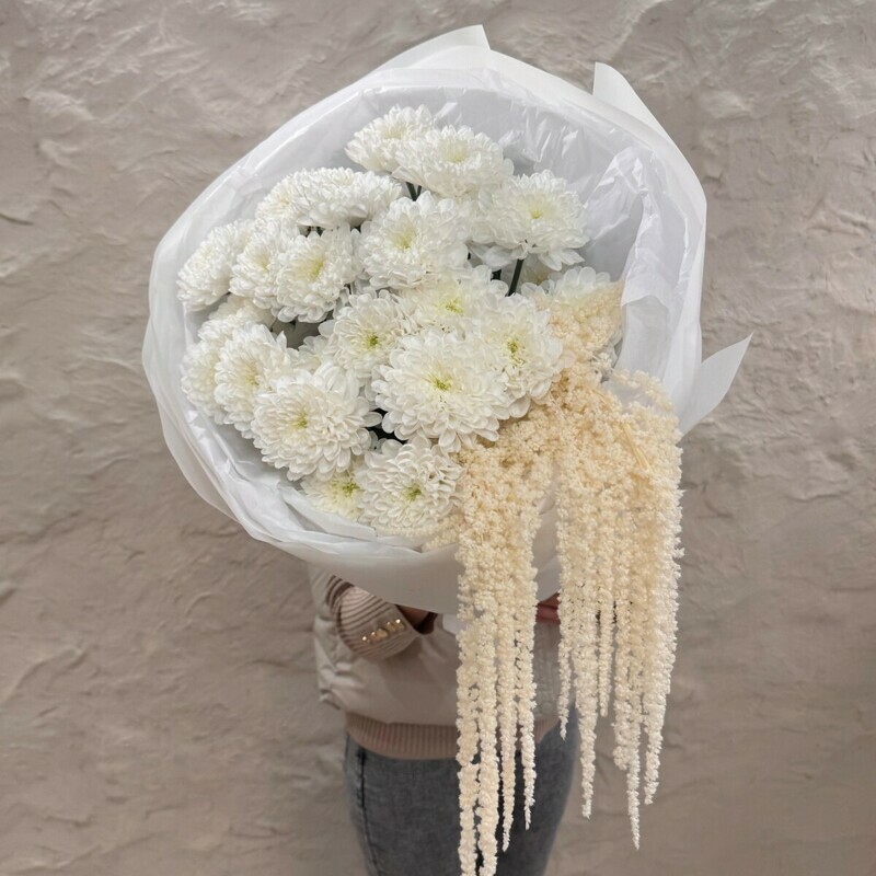 Букет из белых хризантем с амарантом — это композиция, состоящая из белых хризантем и амаранта. Белые хризантемы в букете придают ему изысканность и нежность, а амарант добавляет яркие акценты. Такой букет может стать отличным подарком для любого случая или просто способом выразить свои чувства и эмоции. Букет оформлен в стильной упаковке, которая подчеркивает красоту и гармонию цветов.