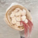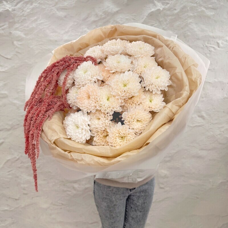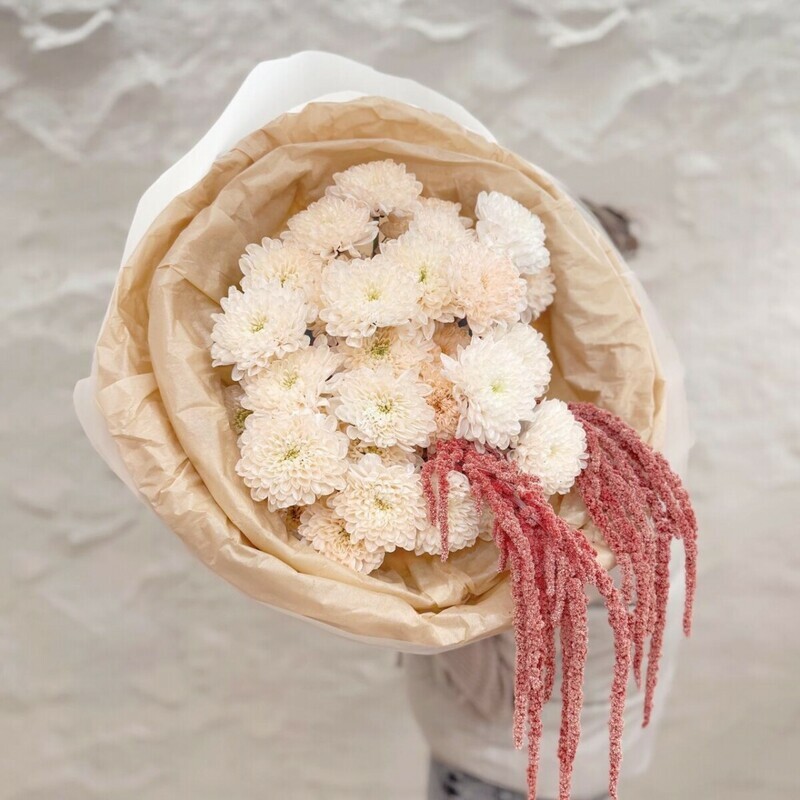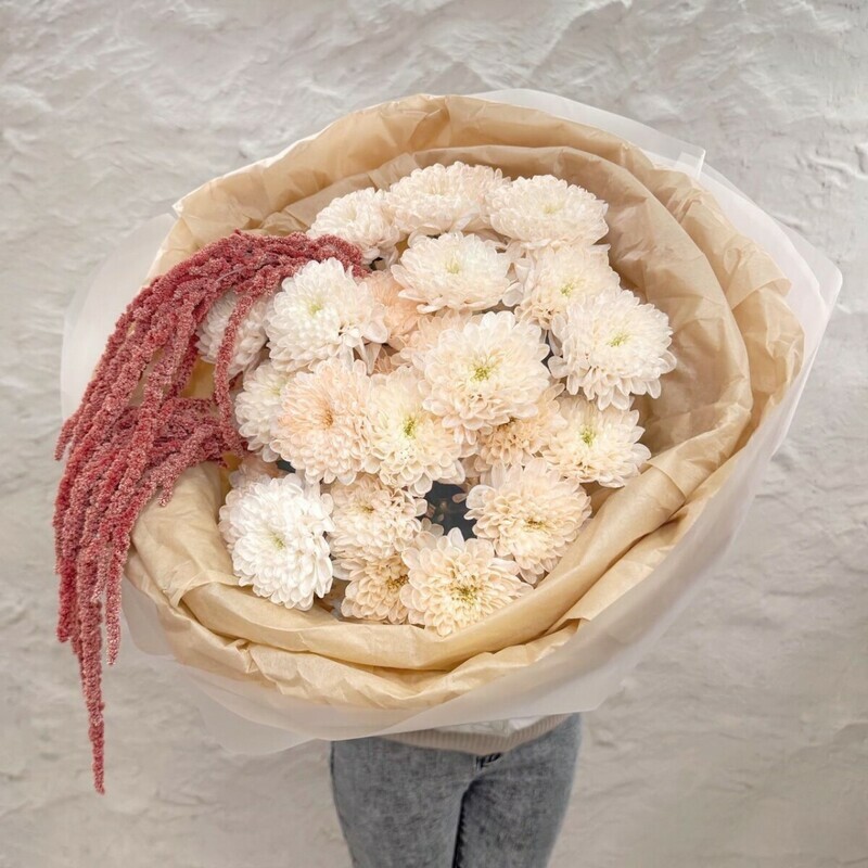 Букет из персиковых хризантем с амарантом Нежный и изысканный букет, состоящий из персиковых хризантем и амаранта. Хризантемы в персиковом оттенке создают атмосферу уюта и тепла, а амарант добавляет яркости и изысканности. Этот букет станет прекрасным подарком для любого случая или просто способом выразить свои чувства и заботу. Букет отличается гармоничным сочетанием цветов и может стать как самостоятельным подарком, так и дополнением к основному презенту.