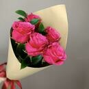 - 5 ярких розовых малиновых роз с зеленью