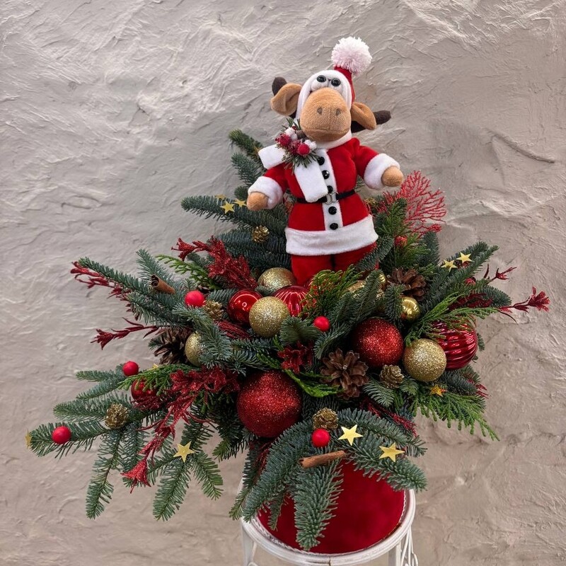 Новогодняя композиция из нобилиса — настоящее произведение искусства. Нобилис отличается пышной и ароматной зеленью. В центре — рождественский олень ручной работы и новогодний декор, которые придают яркость и красочность! Композиция передает ощущение волшебства и тепла Нового года, наполняя пространство ароматом хвои. Она добавит элегантности и праздничного настроения любому интерьеру.