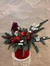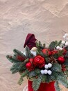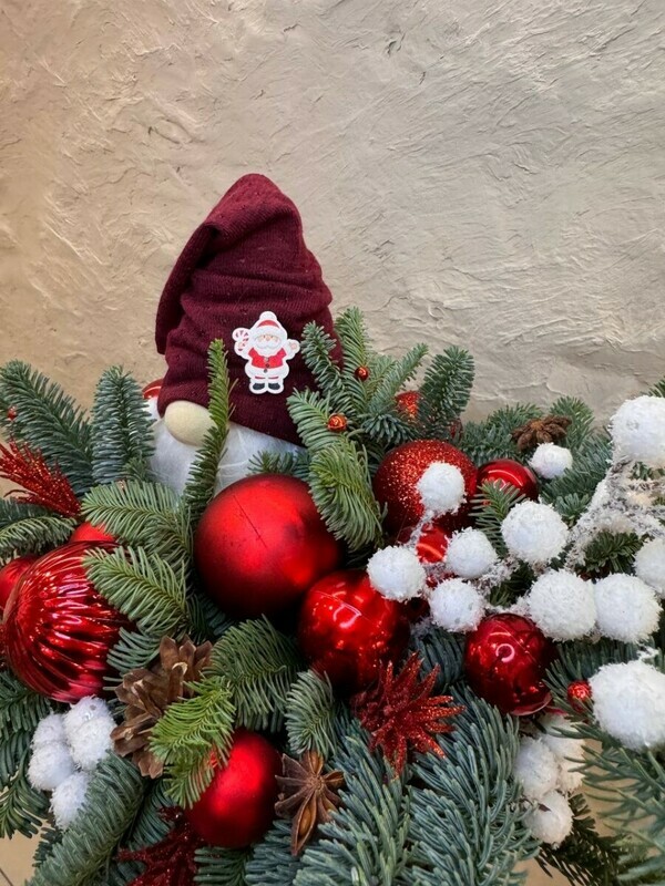 Новогодняя композиция с гномиком в бордовом колпаке — это яркое и праздничное украшение для интерьера. Основу композиции составляют пышные ветки нобилиса, которые символизируют свежесть и натуральность зимних украшений. Гном в бордовом колпаке является центральным элементом композиции. Он добавляет ей ощущение сказки и веселья. Бордовый цвет колпака гармонично сочетается с зеленью нобилиса, создавая яркую и запоминающуюся картину. Композиция дополнена новогодним декором.Это усиливает праздничное настроение и придает композиции завершённый вид. Такая композиция станет замечательным украшением для новогоднего стола, окна или камина. Она создаст атмосферу праздника и веселья, а также порадует глаз своей красотой и оригинальностью.