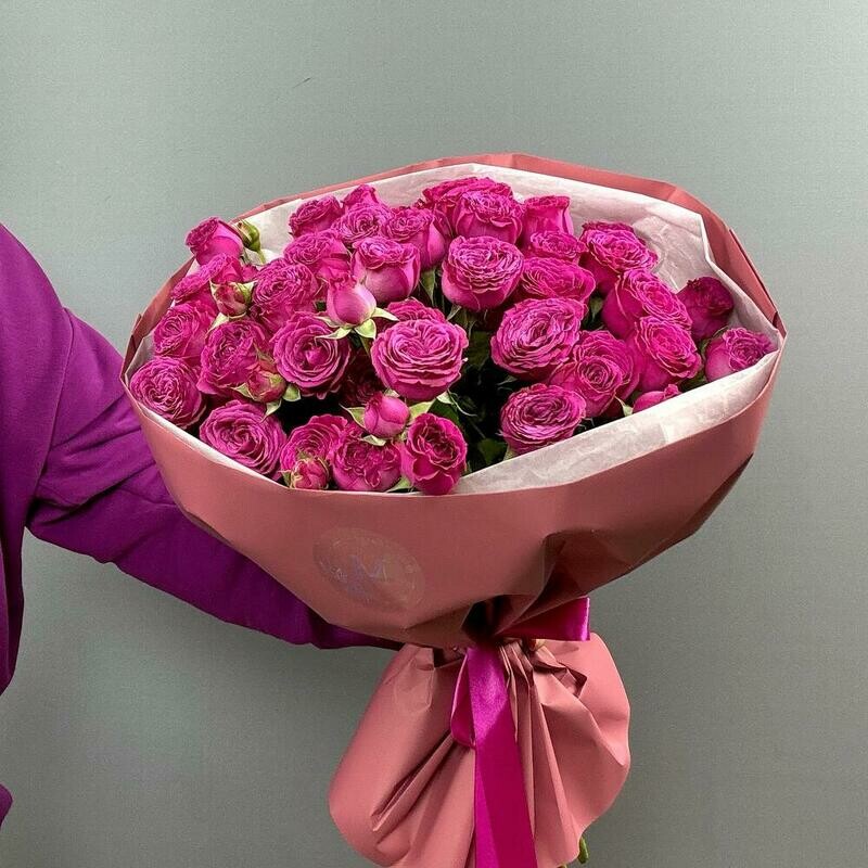Пионовидные яркие кустовые розы в стильном букете 9 шт, стандартный