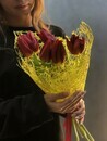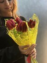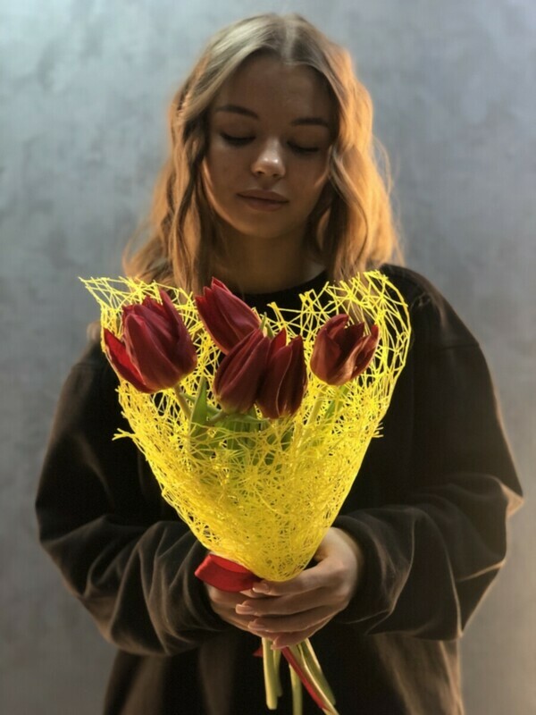 - Букет красных тюльпанов в желтом оформлении. 5 шт.