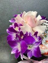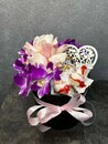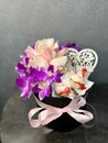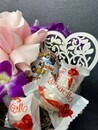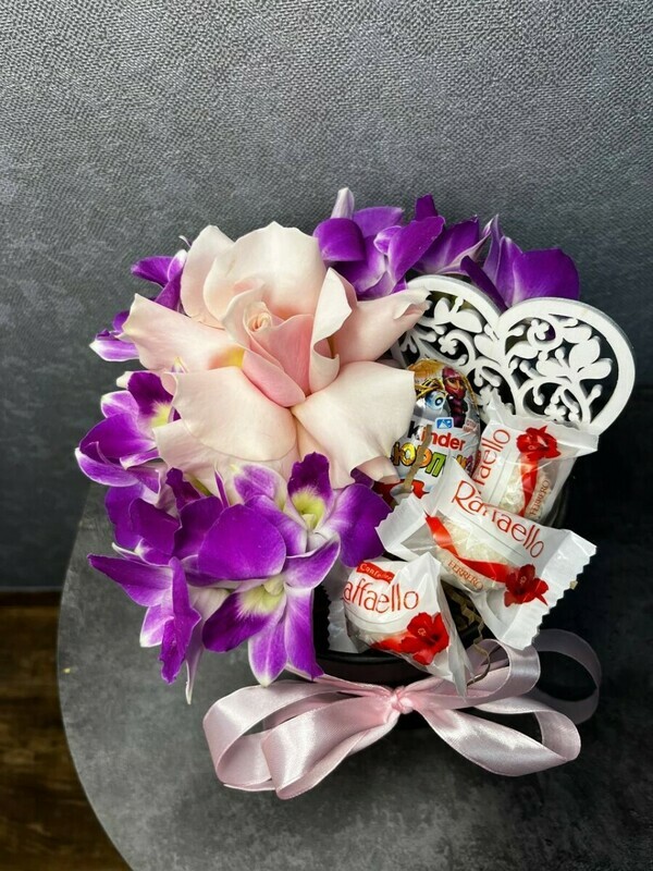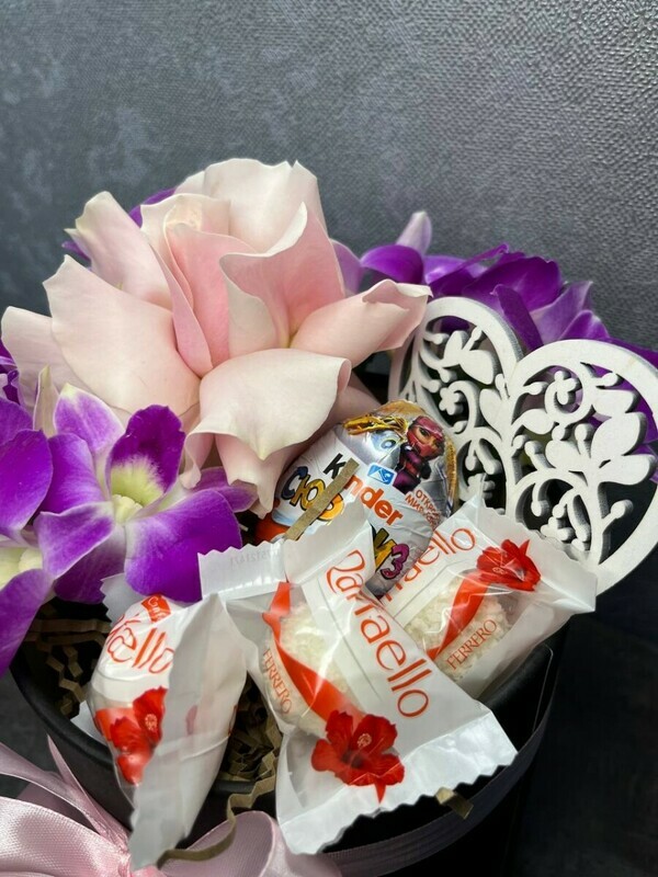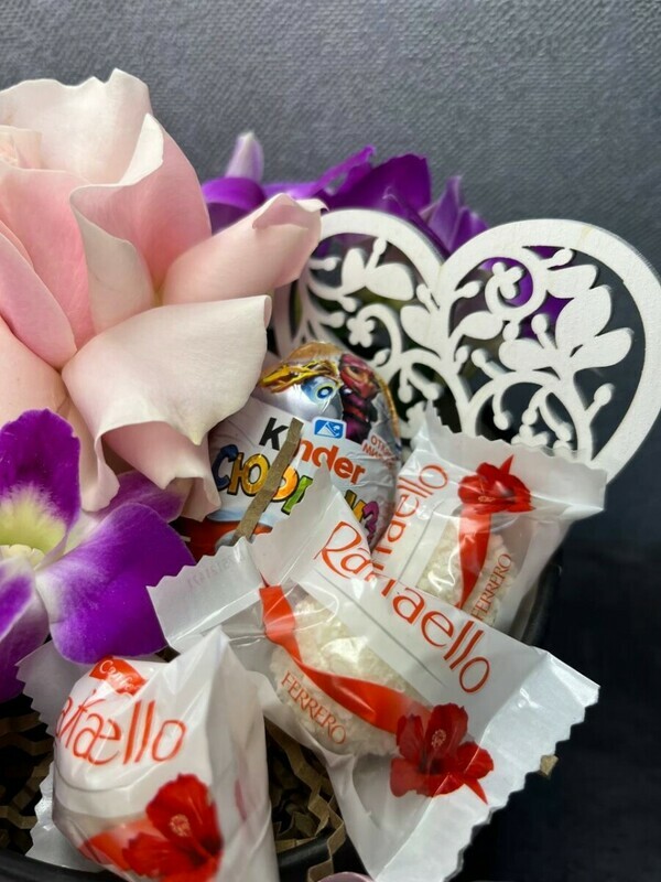 Изящная композиция в чёрной шляпной коробке — это сочетание утончённых цветов и изысканных сладостей, созданное для того, чтобы подарить радость и восхищение. В центре композиции — роскошные фиолетовые орхидеи, которые притягивают взгляд насыщенным цветом и изысканной формой лепестков. Их дополняют нежные розовые розы, придающие букету романтичность и мягкость. Такое сочетание цветов создаёт гармоничный баланс между страстью и нежностью. Среди цветочной композиции уютно расположились любимые лакомства: конфеты Raffaello — изысканное сочетание кокосовой стружки и кремовой начинки, завернутое в элегантную упаковку; яйца Kinder — для тех, кто любит сладкие сюрпризы. Особую изюминку композиции придаёт декоративный элемент в виде ажурного сердечка — символ любви и заботы. Такой презент подойдёт для любого повода: день рождения, 8 Марта, День святого Валентина или просто как знак внимания.