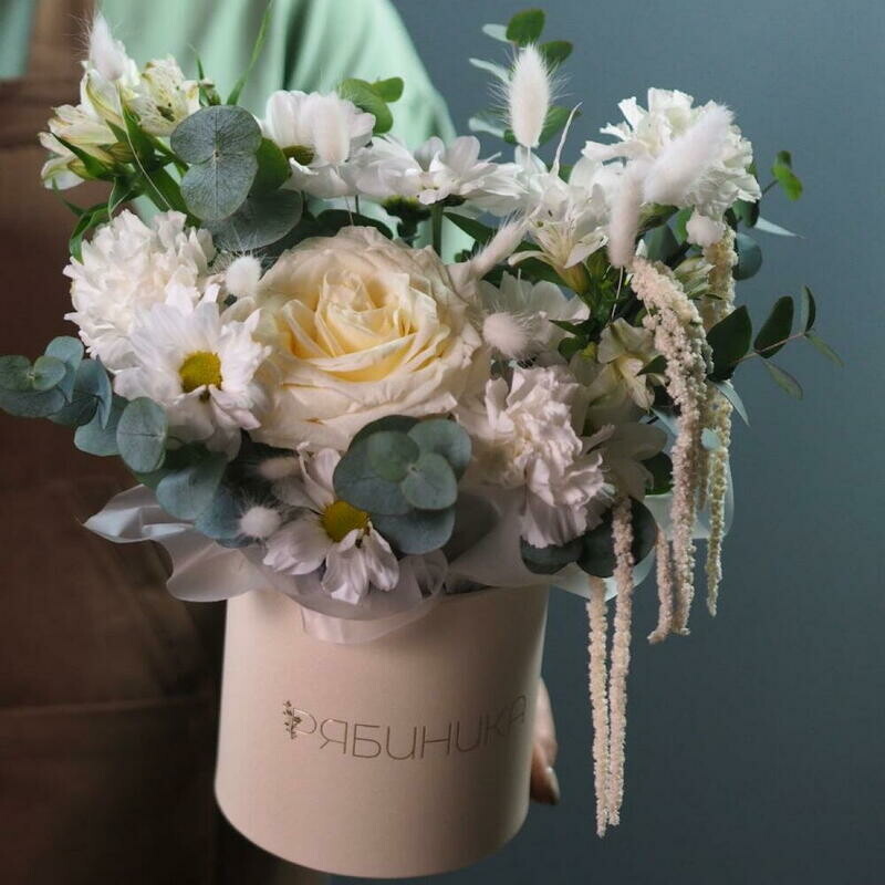 Композиция в коробке из альстромерии, диантуса и эвкалипта, стандартный