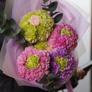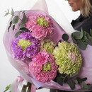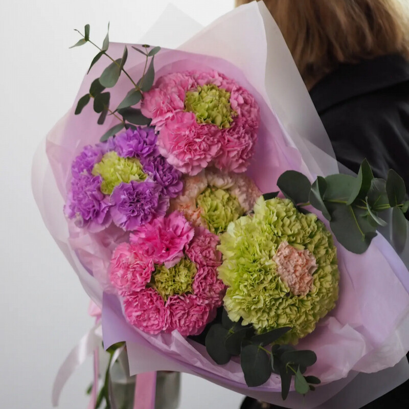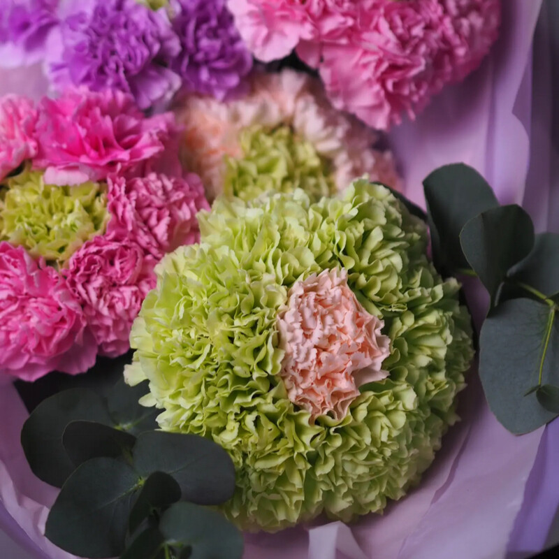 Букет из 35 разноцветных гвоздик и трех веточек эвкалипта