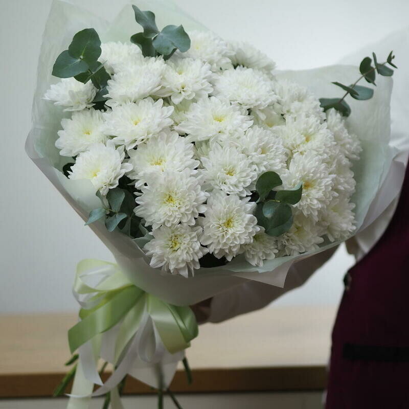 Букет из 9 белых кустовых хризантем и эвкалипта, стандартный