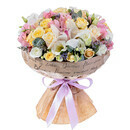 В букете из восхитительных белых орхидей цимбидиум, прелестных розовых альстромерий, белоснежных лизиантусов, синего лимониума, кремовых кустовых и одноголовых роз, а также изумрудной зелени салала живёт романтика и нежность. В этих нежных красках и трепетном цветочном аромате, которые вы подарите тем, кто вам действительно дорог, заиграет музыка вашей души.