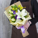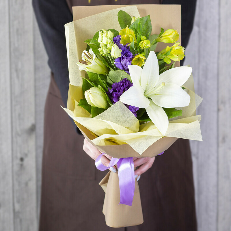 Если вы ищете идеальный букет-комплимент, то этот букет - то, что вам нужно. Белая лилия - центральное украшение данной композиции, напоминает луну на фоне синих лизиантусов. А жёлтые альстромерии ассоциируются со звёздами. По-настоящему впечатляющий подарок, который не оставит никого равнодушным.